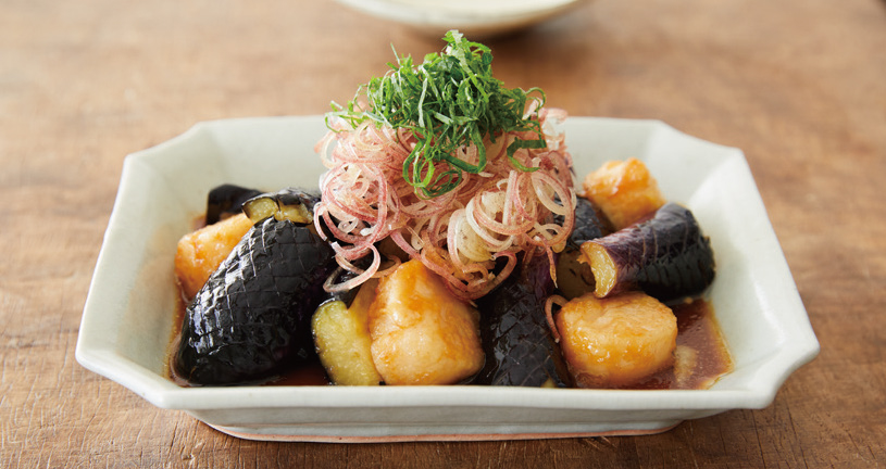 ①ナスは縦半分に切って皮側に格子状に浅く切り目を入れ、長さを半分に切る。ミョウガは薄い小口切り、青ジソはせん切りにする。ホタテは片栗粉を薄くまぶす。